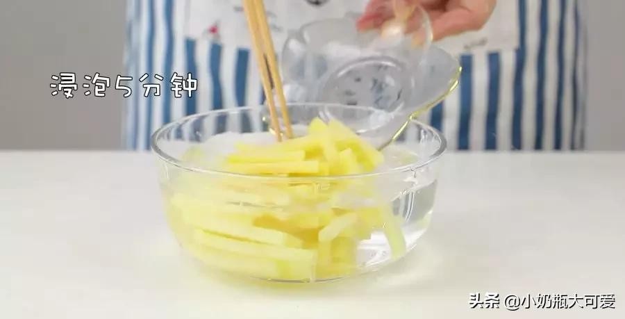 2. 切好之后用清水浸泡土豆条5分钟。