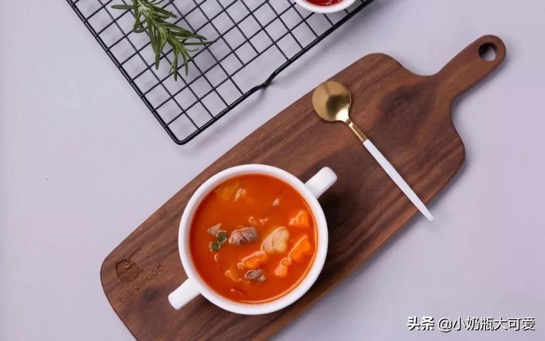这是一道西式浓汤,番茄红素,维生素C和胡萝卜素等营养都溶入汤中,酸酸甜甜的味道也很受宝宝喜欢。暖暖的一小碗,装满妈妈的爱。