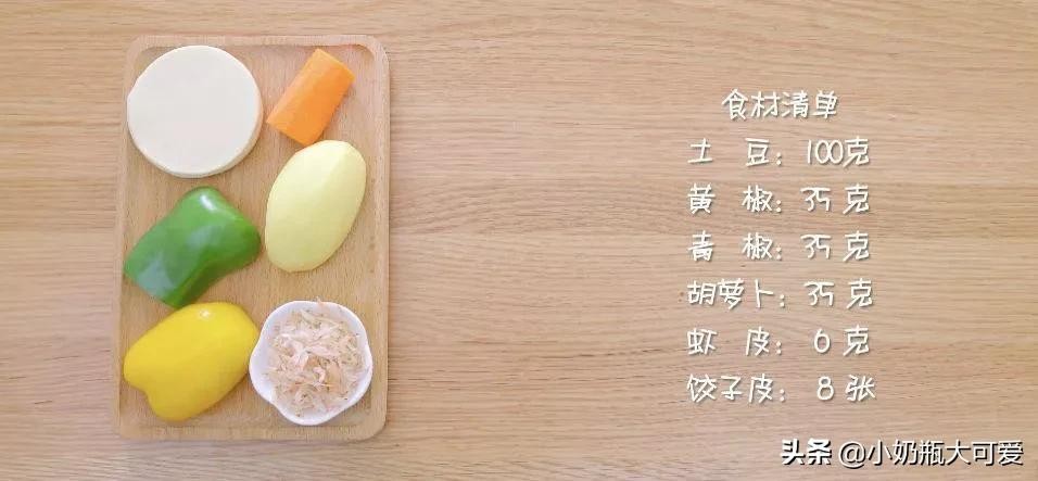 食材:土豆100克、黄椒35克、青椒35克、胡萝卜35克、虾皮6克、饺子皮8张。