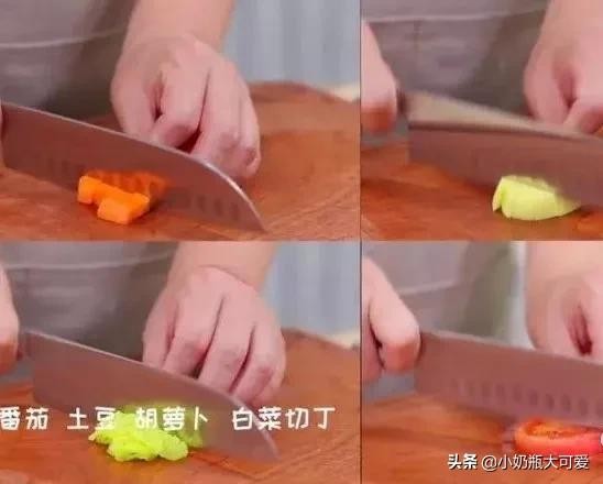 6、将番茄、土豆、胡萝卜、白菜,4种蔬菜分别切成小丁。