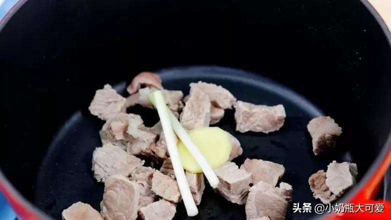 2、将焯好的牛肉丁放入锅中,锅内再加入姜片、葱段。