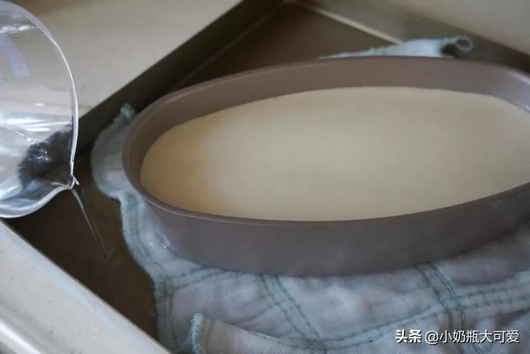 12、烤盘倒入1公分高度的水,把模具放入,预热好的烤箱120度烤90分钟,时间到了不要取出,焖30分钟后取出。
