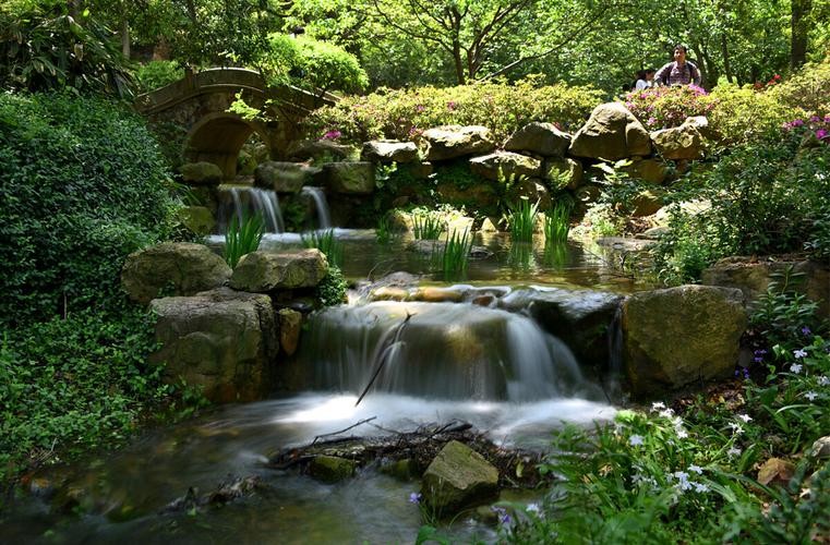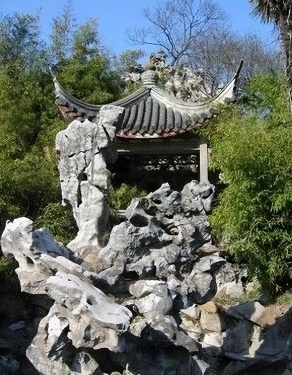 假山之侧,配以小亭、莲舫、池塘、小溪、曲桥、石笋;缀以青松翠竹及各种名贵花木,具有会稽兰亭风光。