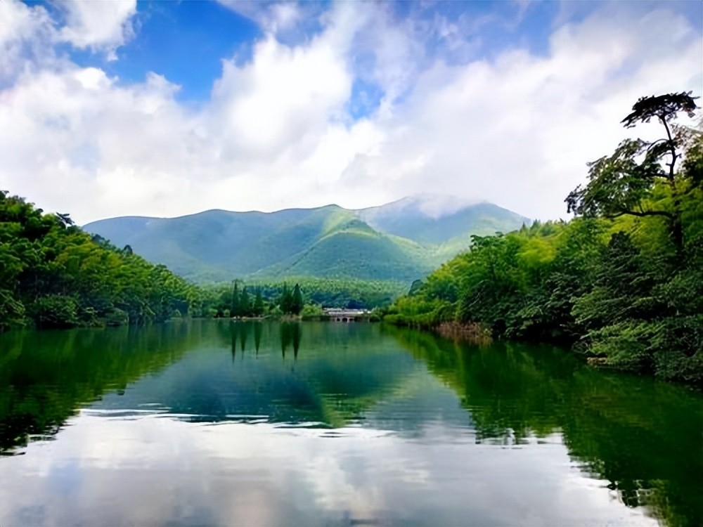 在竹海中,两山夹峙之间,山涧水和天然雨水汇集成了小小的“镜湖”,湖水终年清冽,竹在水中长,水在竹间流,镜湖与绵延的竹海相映。
