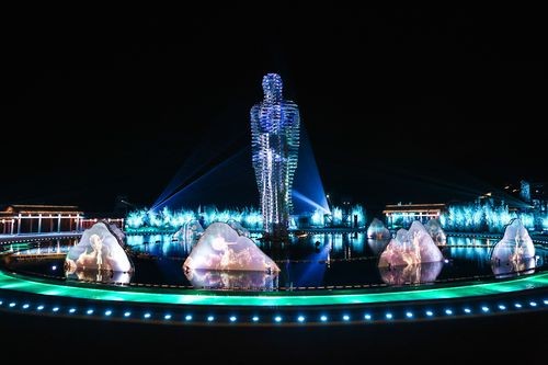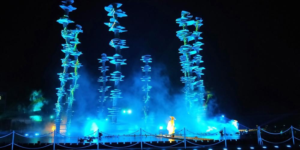 微笑广场全新升级的舞美灯光效果,采用了水下舞台装置、全息数字影像屏、高流明激光投影等五大视觉演绎手法,打造出360°的梦幻表演景致,