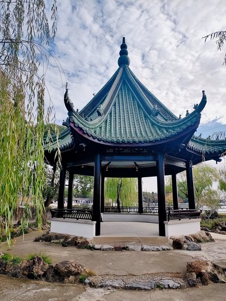 南堤春晓原属渔庄,今已纳入蠡园范围。南堤西南角建有仙鹤亭,六角形。