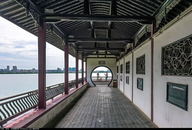 千步廊临湖,曲岸枕水。廊的北侧筑墙,上开漏窗,漏窗用青瓦砌成,图案各异,南侧临水敞开,置朱栏坐槛,中架两座廊桥,廊内有月洞七处,使长廊显得深邃。