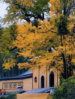 寂照禅寺掩映于竹林,依傍于古木,两株古老的娑婆树、银杏树树干粗壮,虬枝苍老繁茂 。而耸立于寂照寺前的千年银杏,树身径围5米,高30余米,树龄古老。