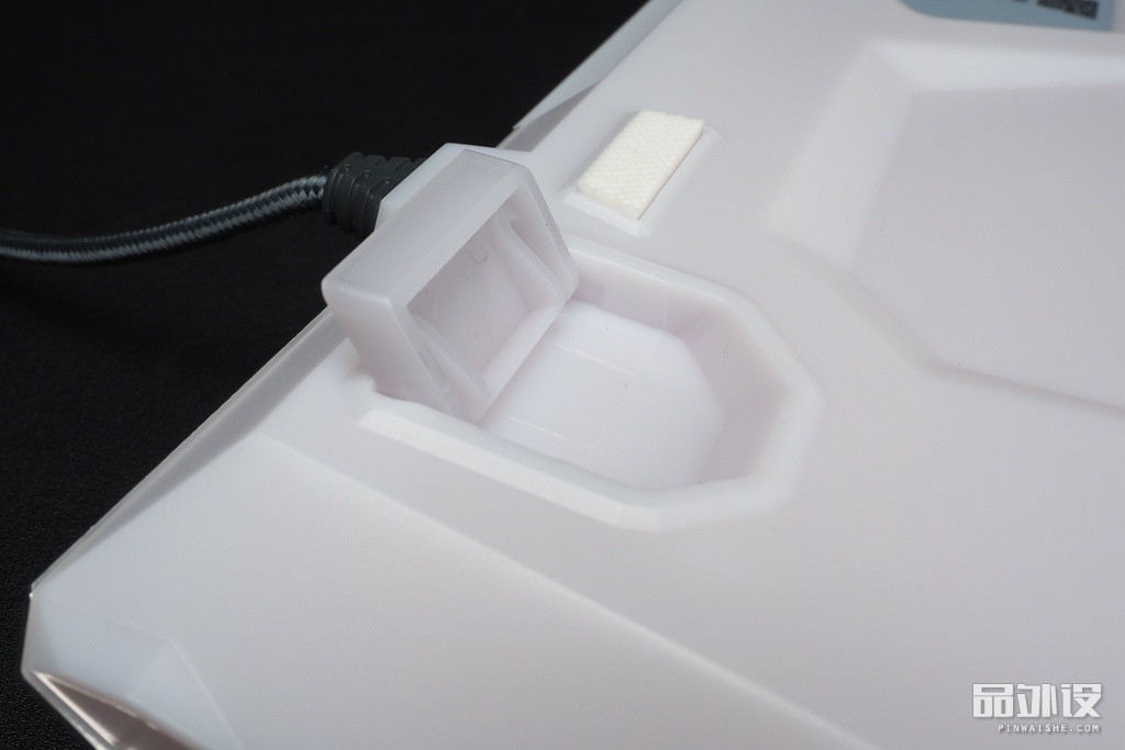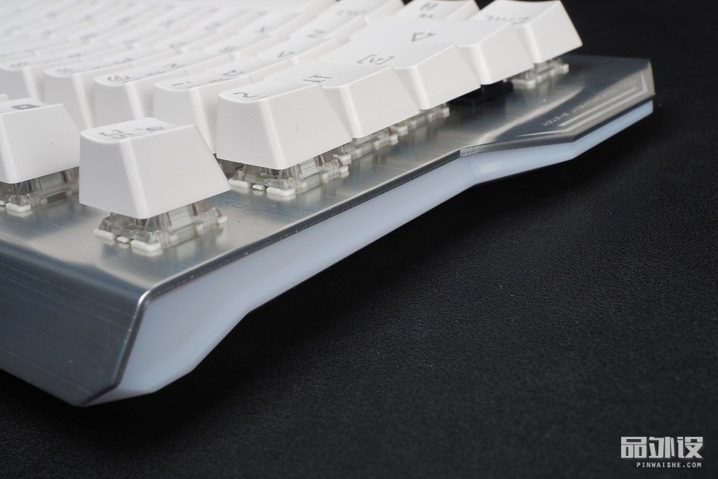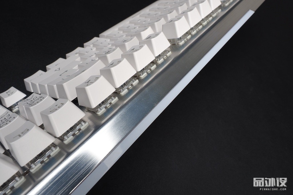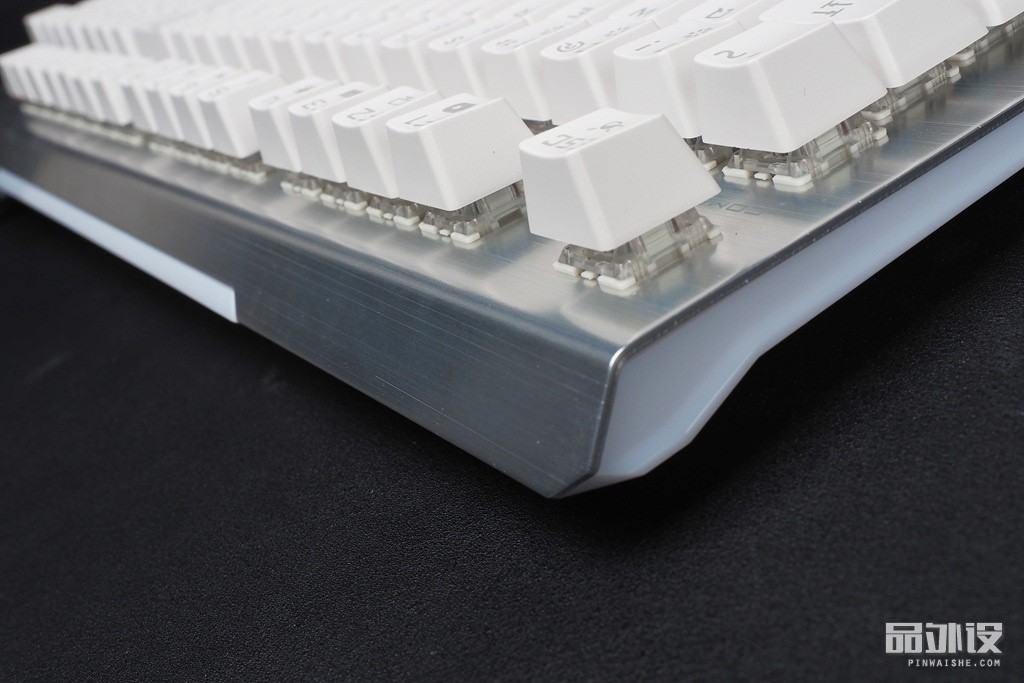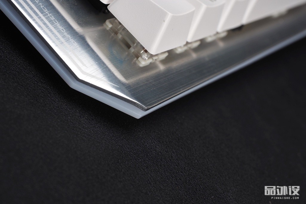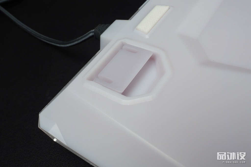 键盘侧翼与底壳是一体的,不过侧翼部分做成雾状可透光设计。