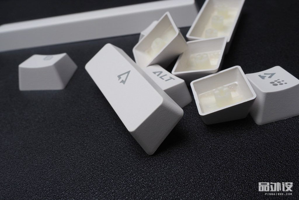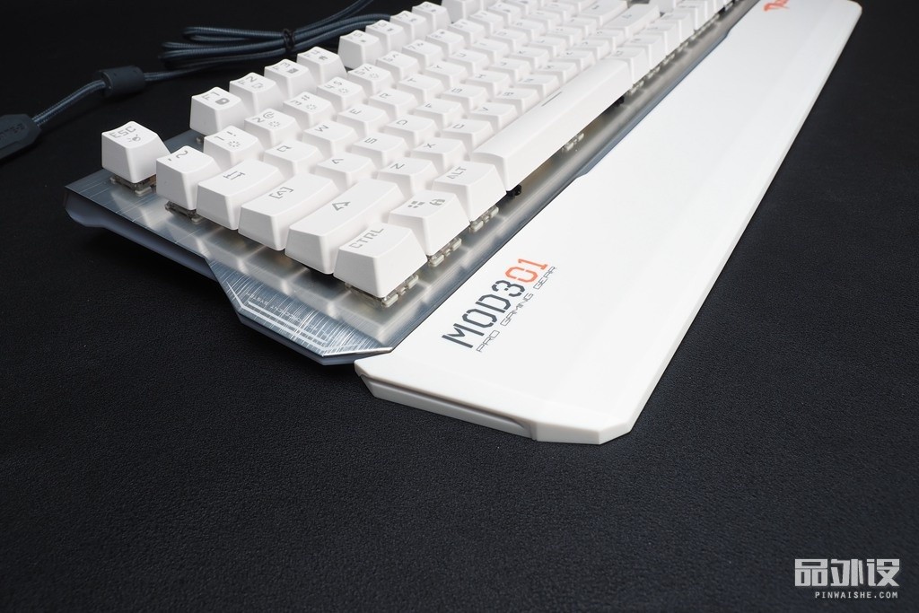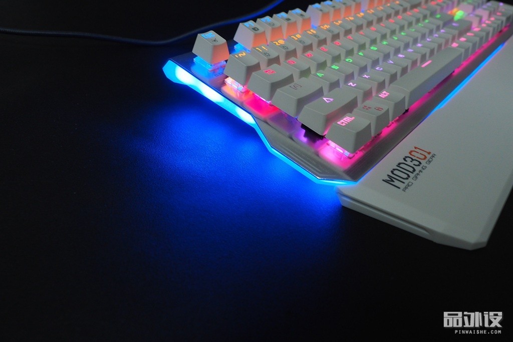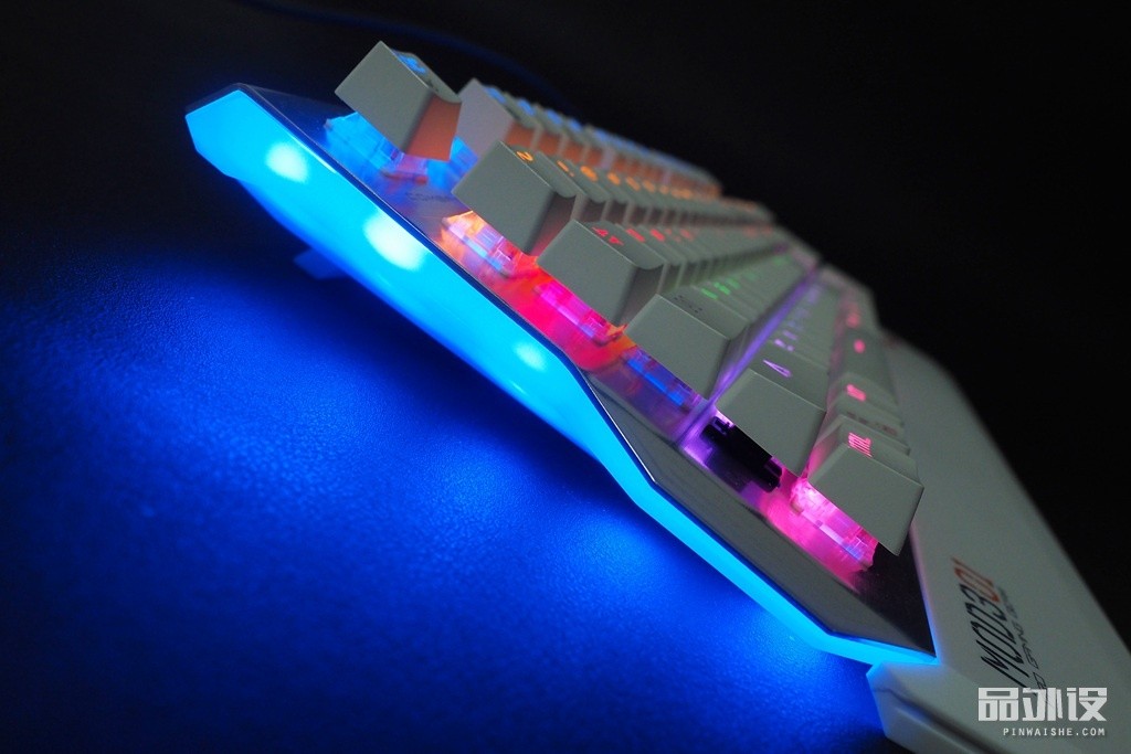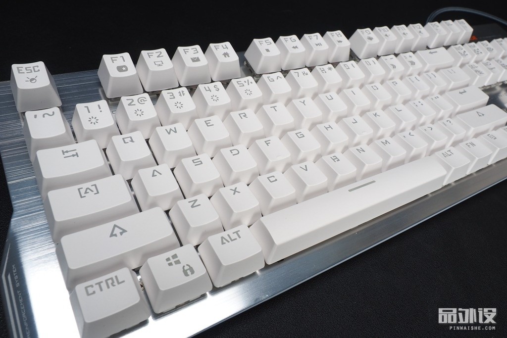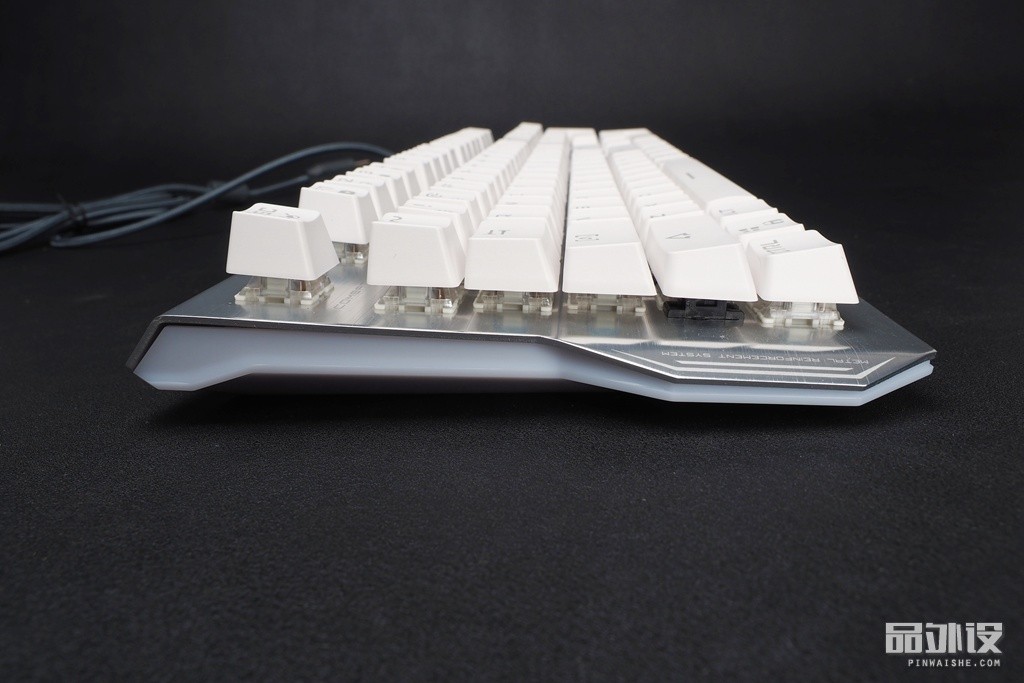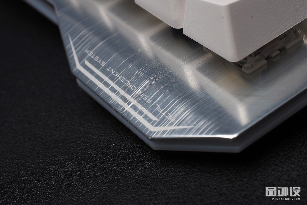 键盘侧翼与底壳是一体的,不过侧翼部分做成雾状可透光设计。