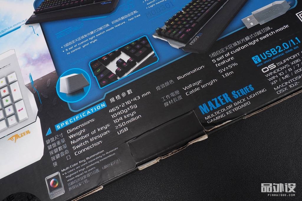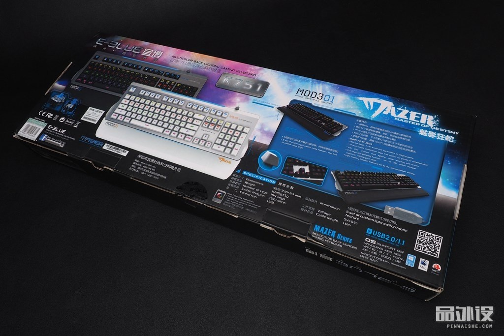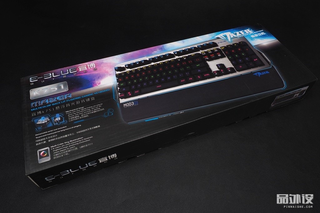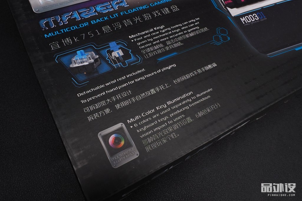 宜博K751机械键盘采用宜博家族式包装,包装设计采用黑色+宇宙星云背景图案,正面是产品名称、图样和部分特性说明,包装设计方面还是相当大气的。