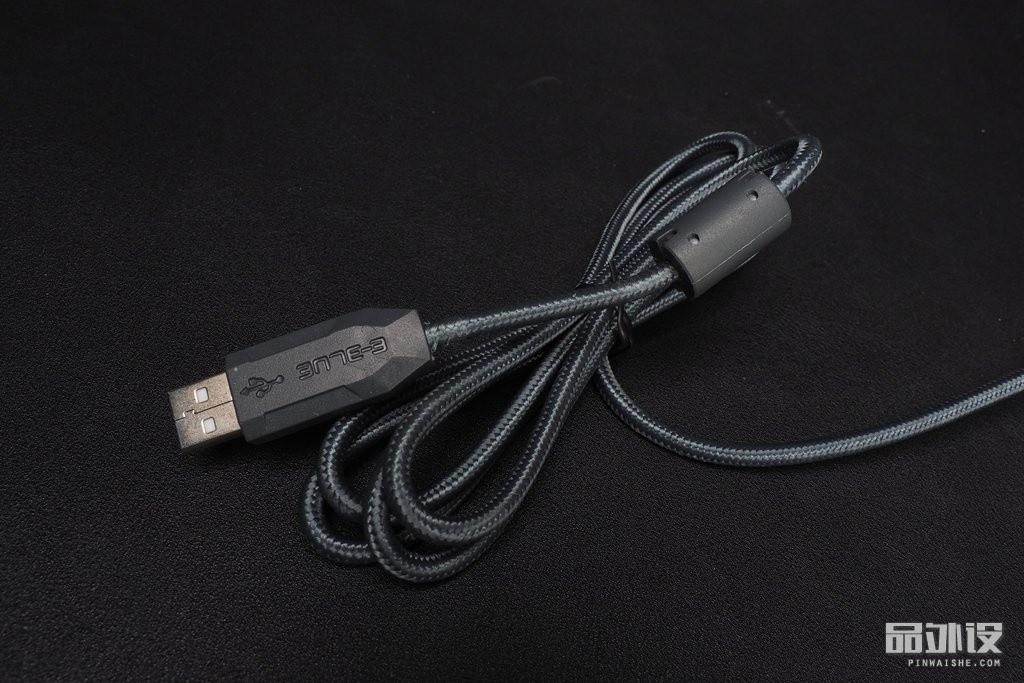 线材方面采用灰色编织线材,线材约1.8米,软硬度适中,线上配有抗干扰磁环,USB接口上有宜博英文LOGO。