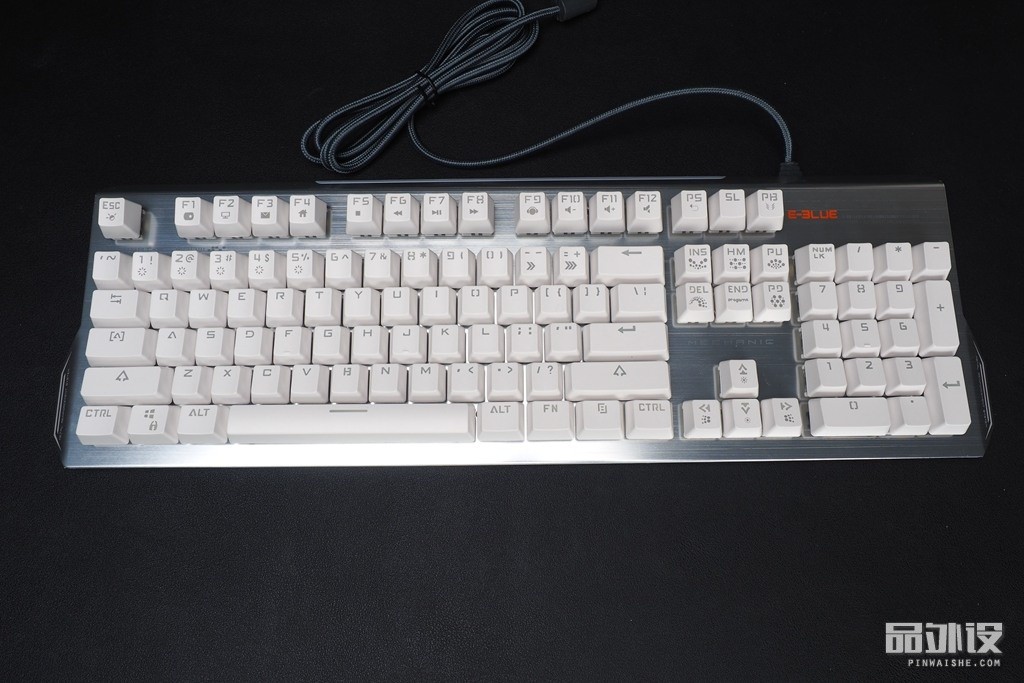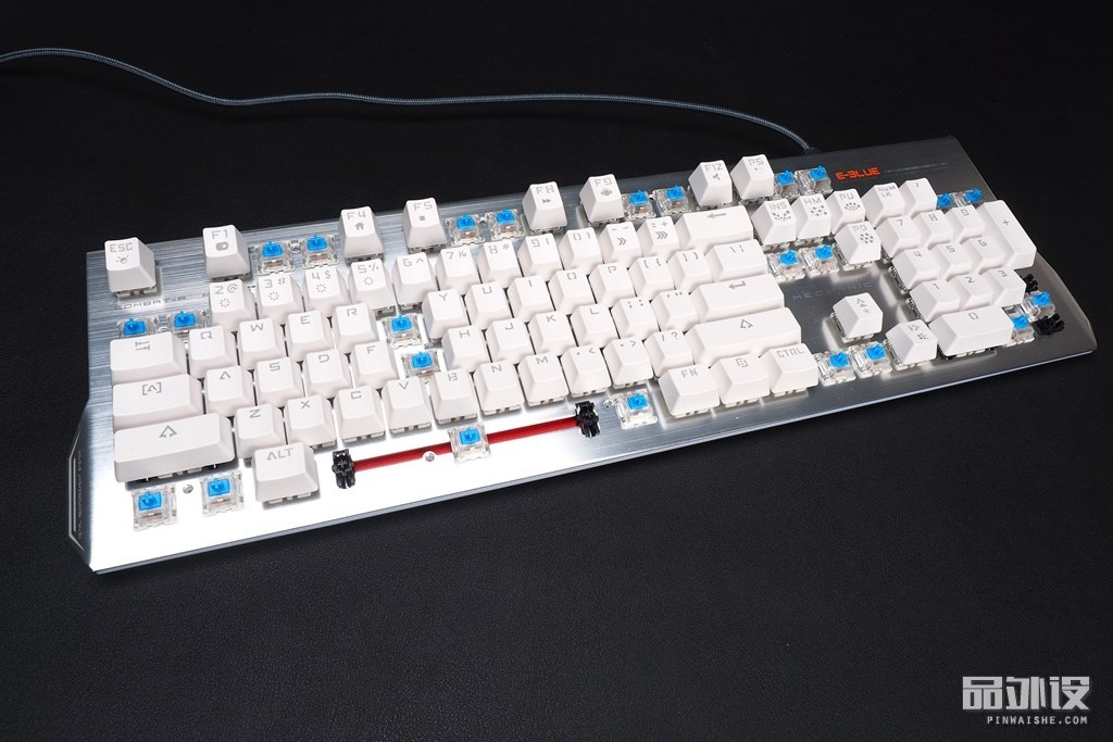 宜博K751机械键盘采用标准美式104键布局,键盘采用不规则的金属上盖,左右两侧下方有向外延伸的设计,整体看起来比较干练。