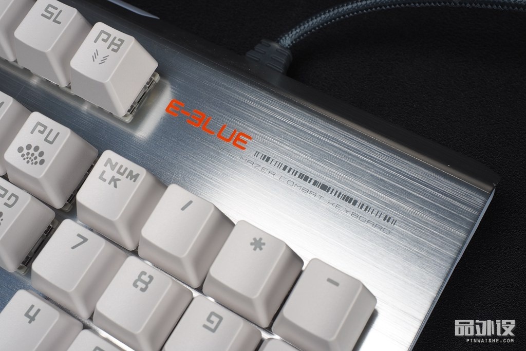 键盘右上角有橙红色的宜博LOGO,非常醒目,右侧和下方分别设计有条码和英文标识,看起来非常有科技感,不过LOGO和条码是印上去的,下方字母则是刻上去的。