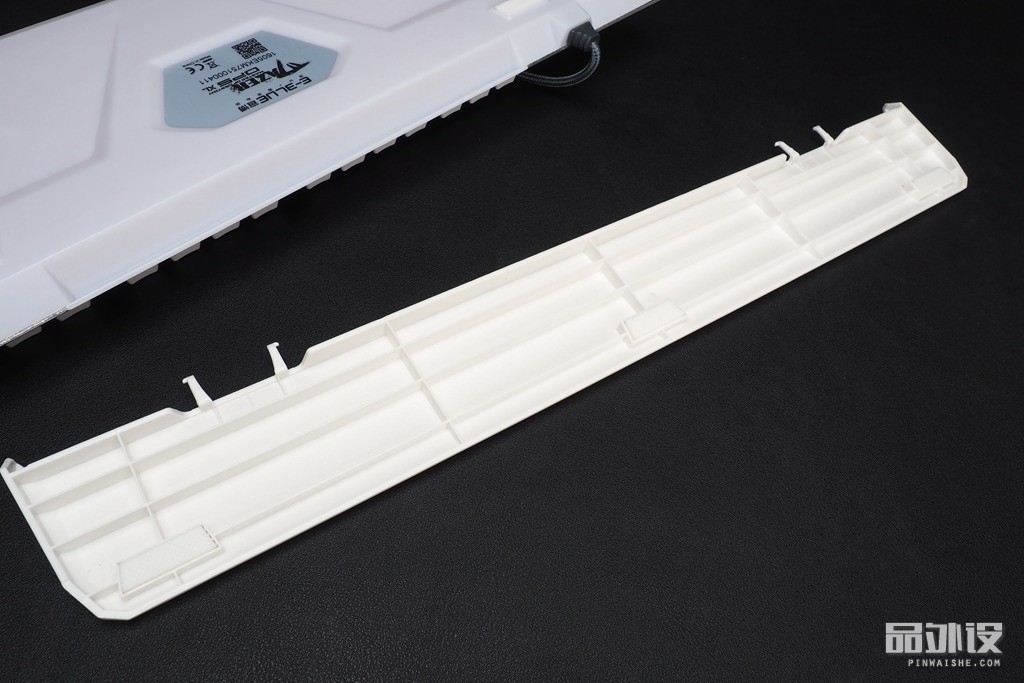 宜博K751手托设计的还是比较精致的,采用白色塑料材质,表面为细腻的磨砂质感,手感舒适,手托上方左右两侧分别印有英文和数字标识,手托下方设计有3个防滑贴和2对卡钩。