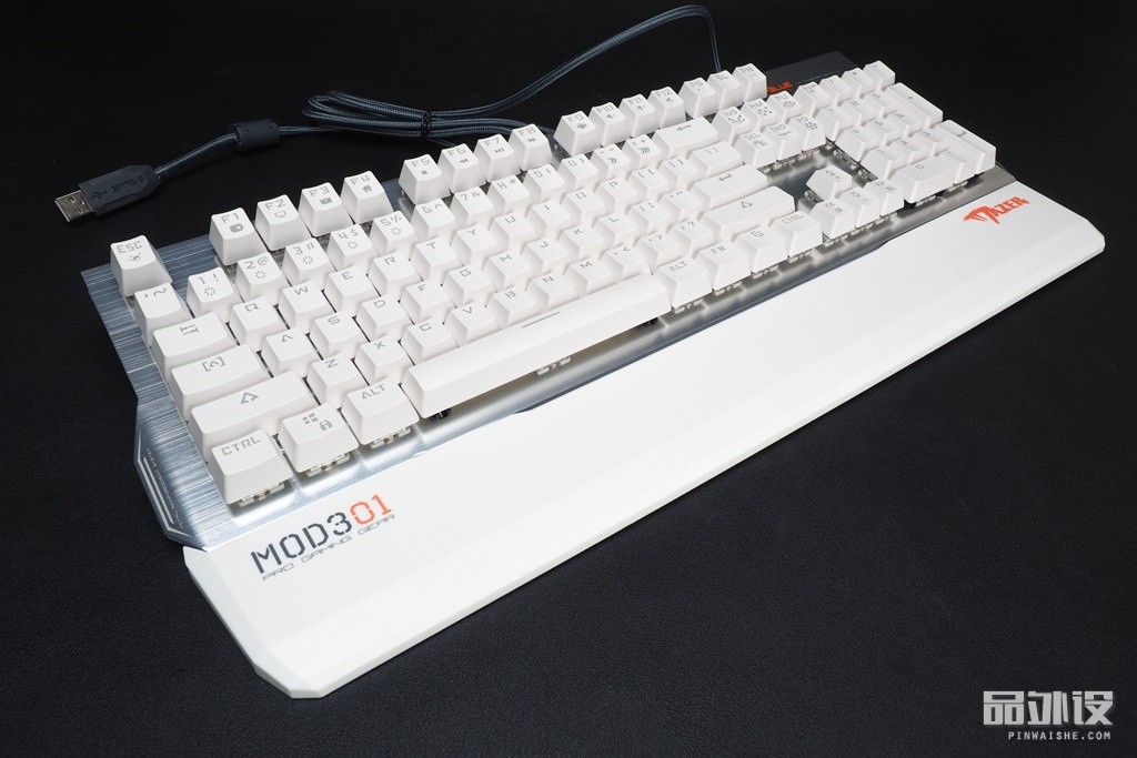 键盘底盘设计与键盘金属上盖的结合度非常高,底部的线条设计也非常有个性。键盘数据线从键盘右上方引出,并做了保护设计。
