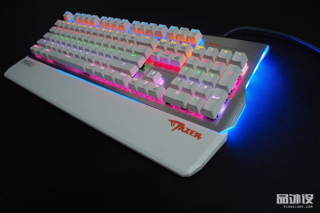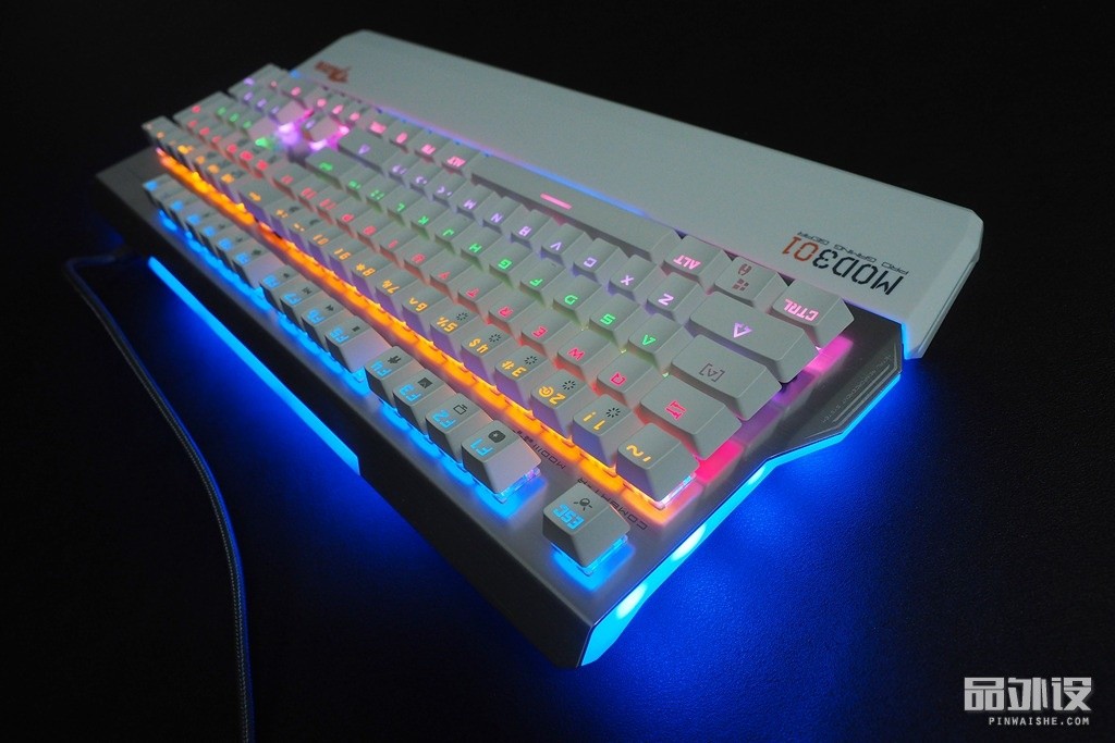 宜博K751机械键盘按键部分灯光采用彩虹横条配色背光效果,比较常见,灯光效果比较常见,有呼吸、常亮、波浪、跑马、涟漪、单点亮等。最主要的是边框前后左右都有蓝色背光效果,整体感觉相当不错,侧翼背光也可以控制关闭。