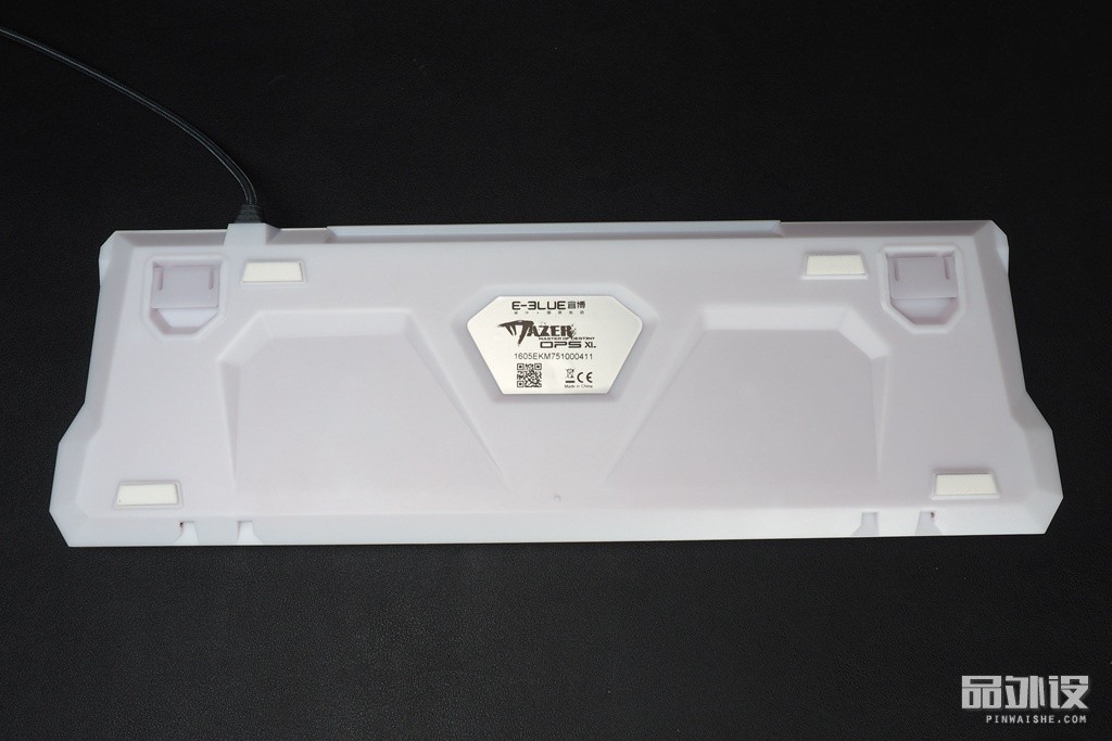 键盘底部采用不规则的线条设计,看起来比较个性,底部分布4个白色条形防滑脚贴。