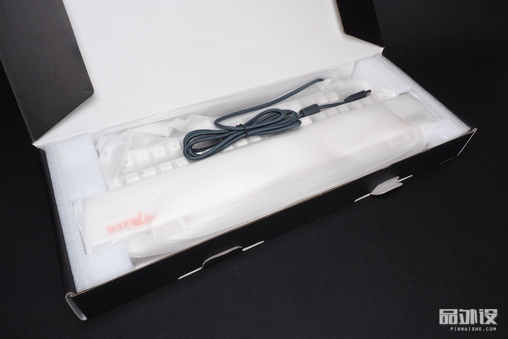包装内部的保护措施还是错的比较到位的,键盘被固定在两个白色泡沫模具中。