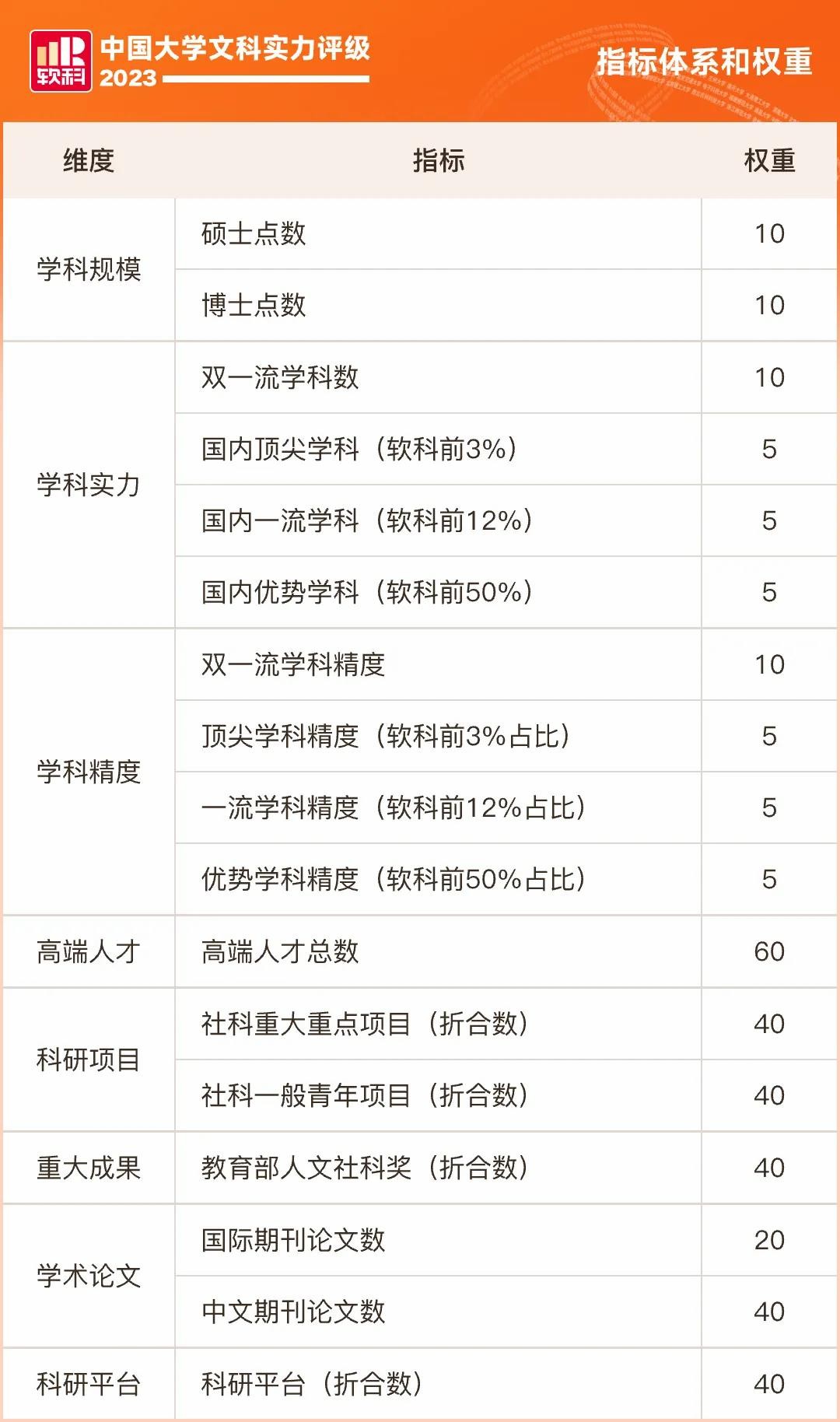 中国大学文科实力评级包含学科规模、学科实力、学科精度、高端人才、科研项目、重大成果、学术论文和科研平台8个维度,涵盖17项指标。今年对指标体系进行了进一步丰富:在高端人才总数指标中新增国际重要期刊负责人变量,涵盖1万多本国际期刊的主编和副主编,体现高校在文科领域的全球学术话语权。