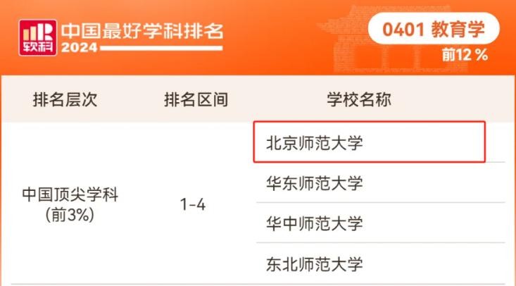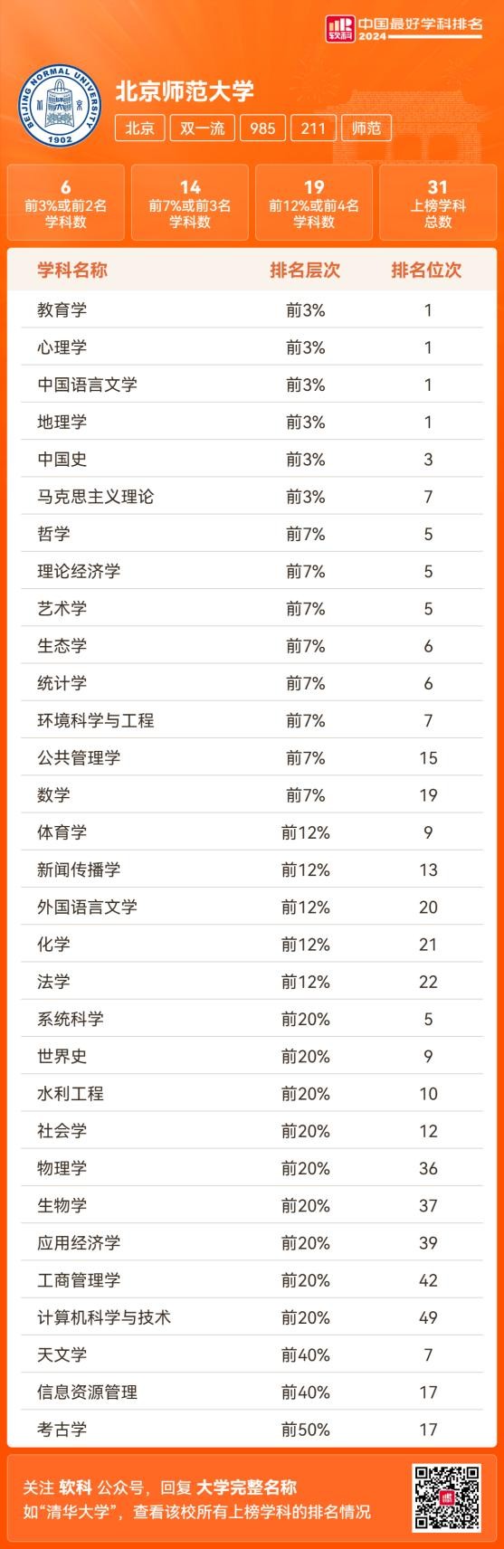 2024软科中国最好学科排名中,北师大有31个学科上榜,6个学科入选中国顶尖学科,包含教育学、中国语言文学、中国史、马克思主义理论,其中教育学、中国语言文学位列全国第1。
