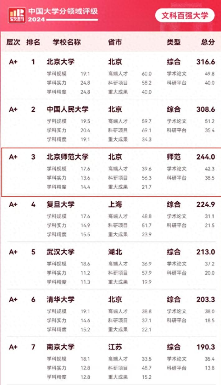 最新!2024中国大学文科实力评级:北京师范大学,稳居全国TOP3