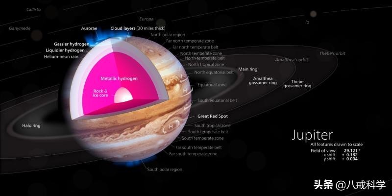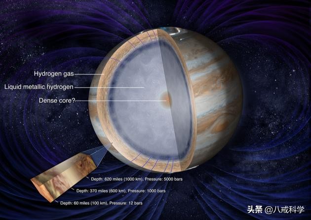 说完木星的质量和体积,我们来看看它的内部结构。虽说木星是一个气态行星,但它也是一个巨大的液态氢星体,并且随着深度的增加,在距离其表面千米处,液态氢就会在高压和高温环境下形成。而且木星也有像地球一样的金属核心,据推测,它的中心区域是一个由硅酸盐,铁等组成的液态内核。