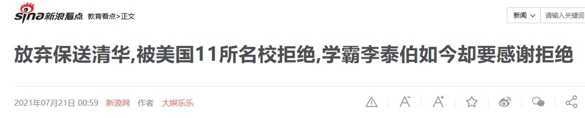 信源2:新浪网 2021年07月21日 00:59 《放弃保送清华,被美国11所名校拒绝,学霸李泰伯如今却要感谢拒绝》