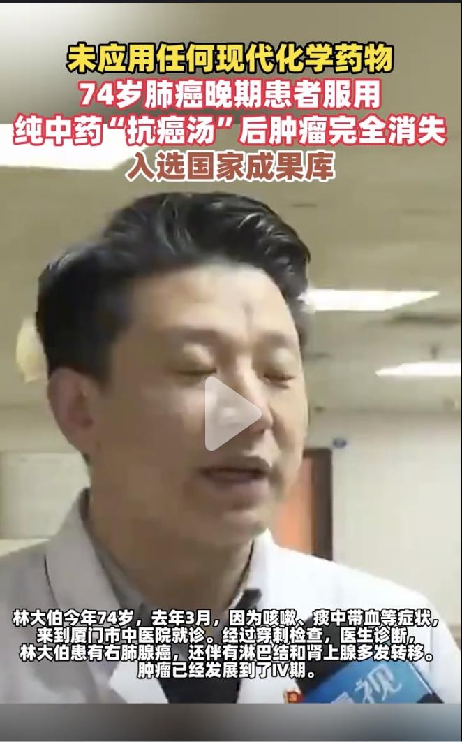 首先,我想和大家聊聊这条新闻。新闻说有一种纯中药的“抗癌汤”能够治好晚期肺癌,让肿瘤完全消失,而且还入选了国家成果库。晚期肺癌、肿瘤完全消失、国家成果库、纯中药……