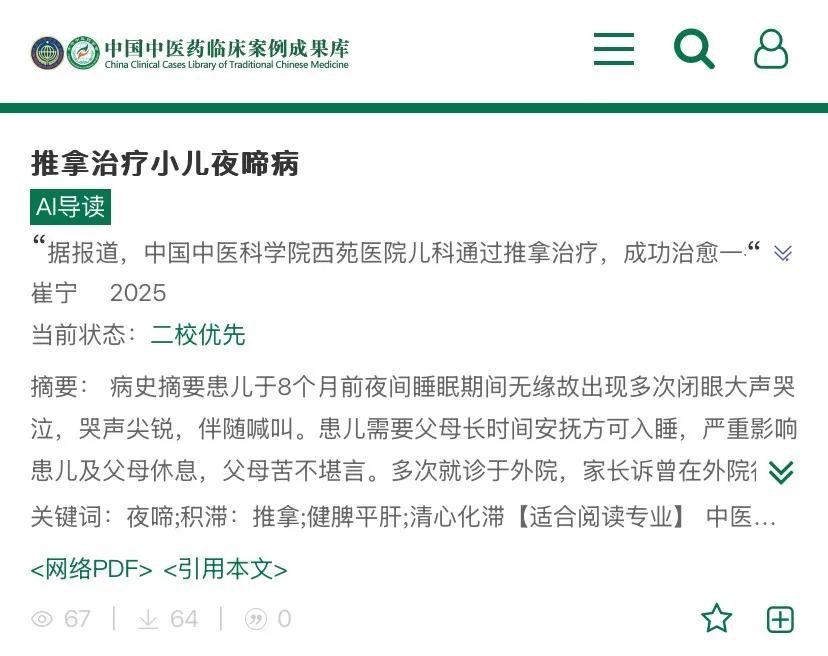 报道中所说的这个国家成果库,听起来似乎是非常厉害的国家重大科技成果库,实际上,它只是中国科协委托民间团体中华中医药学会建设的“中国中医药临床案例成果库”。这个库收录论文的门槛很低,水平也不高。我给大家举个例子,北京西苑医院有个儿科医生的论文《推拿治疗小儿夜啼病》,也被这个所谓的“国家成果库”收录了。