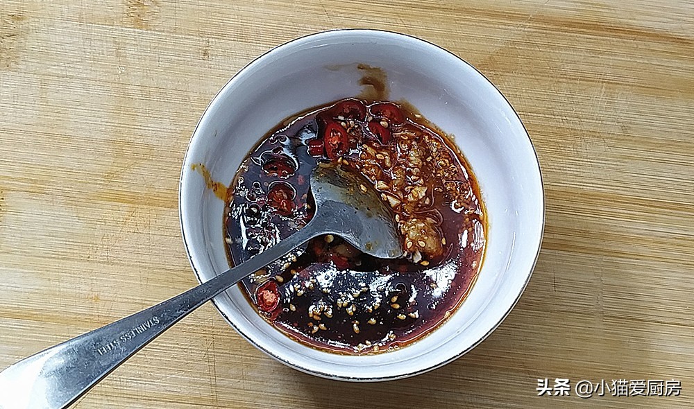 【制作调料】:大蒜3瓣、小米辣2个、盐1勺、鸡精1勺、芝麻酱1勺、香油1勺、辣椒油2勺、生抽2勺、陈醋2勺、白糖1勺