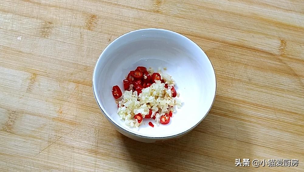 【步骤五】:我们开始准备调料,大蒜拍碎剁成蒜末,小米辣切成圈,然后一起放入小碗中。