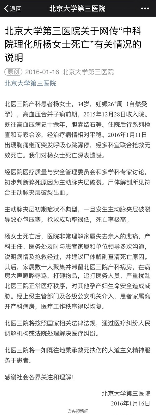 北医三院产妇死亡的事儿这两天在网上吵得炸开了锅。和其他医疗纠纷不同,这次出事的是中科院的科研骨干。所以死者家属除了占据病房、骚扰医务人员外,还发动中科院理化院发了封公函,要求医院调查死因,这还真是把医闹的水平提升到了新高度。