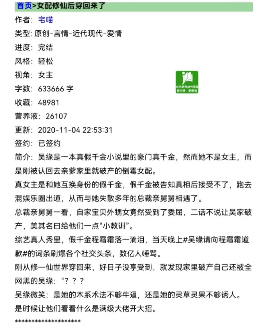 5、《女配修仙后穿回来了》作者:宅喵