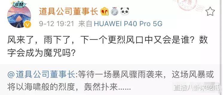 而举报鬼才道具也是继昨天之后再次发出预警:风来了,雨下了,下一个(更)烈风口中又会是谁?数字会成为魔咒吗?此前道具就说过自己收到消息,过段时间将会发生一件大事,牵连很多人:有个数字主播要进去了,我要亲自把他送进去,很多大媒体将来都会公布这个事情,这已经成定局了!当时水友质疑道具是在口嗨,因为前段时间他也举报的几个数字主播(339户外、在石250)都没有封禁(当时举报339户外是因带货食品而出现问题),对此道具直播发wb来证明自己所言非虚,说了一句:道具不才,可能会送走一批!而且数字主播这个事情挺大的,谁也保不了,会上热搜的。