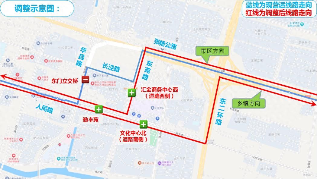 ①市区方向:按原线路—张杨公路—东苑路—人民路—按原线路;