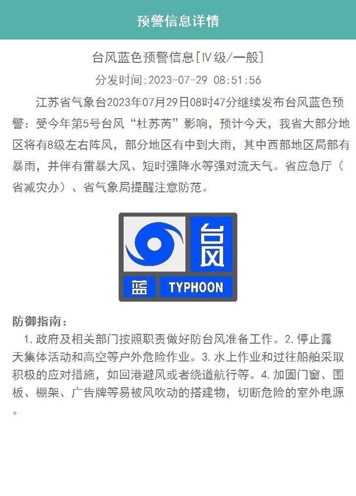交汇点讯 7月29日8时47分,江苏省气象台继续发布台风蓝色预警:受今年第5号台风“杜苏芮”影响,预计今天,江苏大部分地区将有8级左右阵风,部分地区有中到大雨,其中西部地区局部有暴雨,并伴有雷暴大风、短时强降水等强对流天气。省应急厅(省减灾办)、省气象局提醒注意防范。