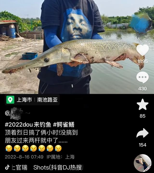 而早在8月16日,这名网友还发布了另一则鳄雀鳝的垂钓视频,“顶着烈日搞了俩小时没有搞到,朋友过来两杆就中了……”视频定位在金山区的南池路亚,通过画面能看到,鳄雀鳝在鱼塘里游,钓友也双手捧起钓到的鳄雀鳝,清晰看到尖长的嘴部,全身长满鳞片。