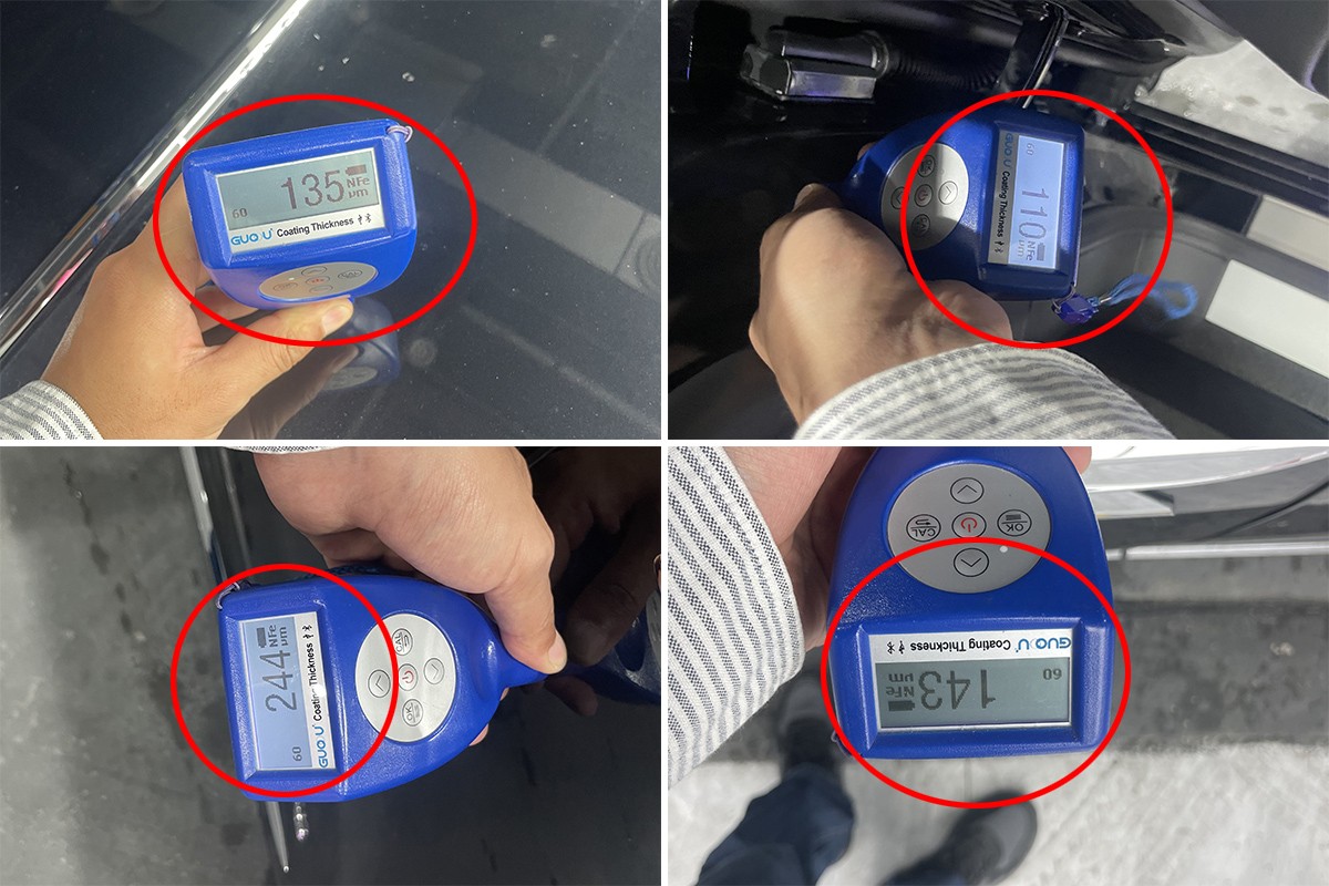 现在我们用漆膜仪来检测漆面,直观数据上显示只有右前翼子板上有后喷漆痕迹,没有钣金修复。不过事故原图上显示,右前翼子板变形严重,已经没有任何修复价值,所以····右前翼子板是后换的,而且换的是拆车件~
