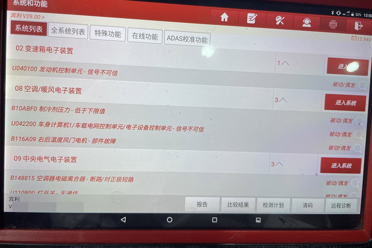 内饰检测结束后又进行了电脑检测,故障还不少,有好几页,不多都是被动偶发类故障,清除之后重新读取未见显示,分析应该是电瓶亏电所导致。