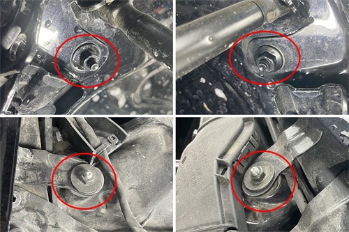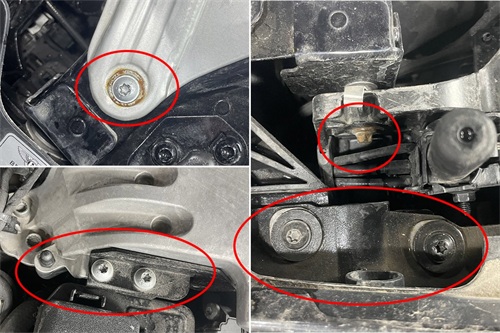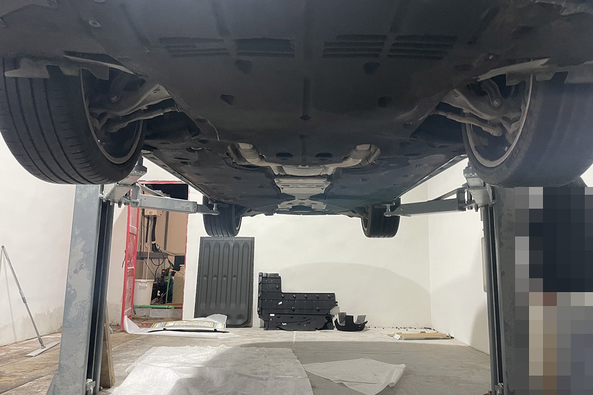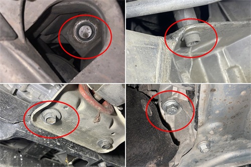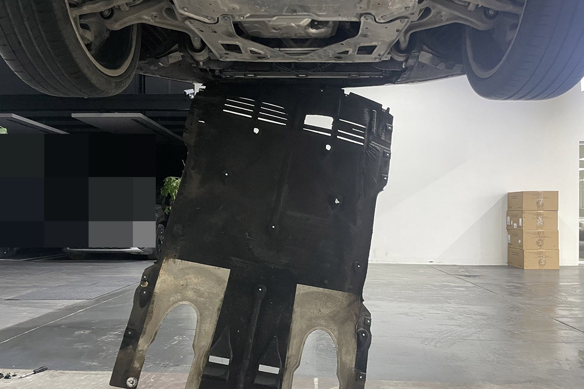 将最大的一块底护板拆下,然后看一下发动机变速箱下边情况。