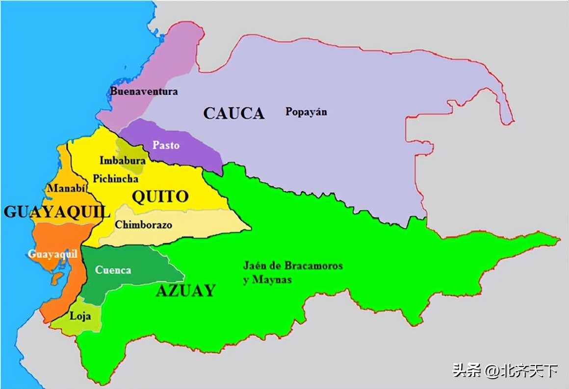 这个版图,比厄瓜多尔今天版图大很多很多,厄瓜多尔刚独立,就攻克了哥伦比亚的考卡省(紫色部分),不过没维持多久就丢了,厄瓜多尔和秘鲁,争夺亚马逊的洛雷托雨林地带(该图的东半部分,大部分的绿色),争夺了一百多年!1941年,厄瓜多尔和秘鲁爆发大战,秘鲁夺取了洛雷托雨林,厄瓜多尔丧失了一半国土!