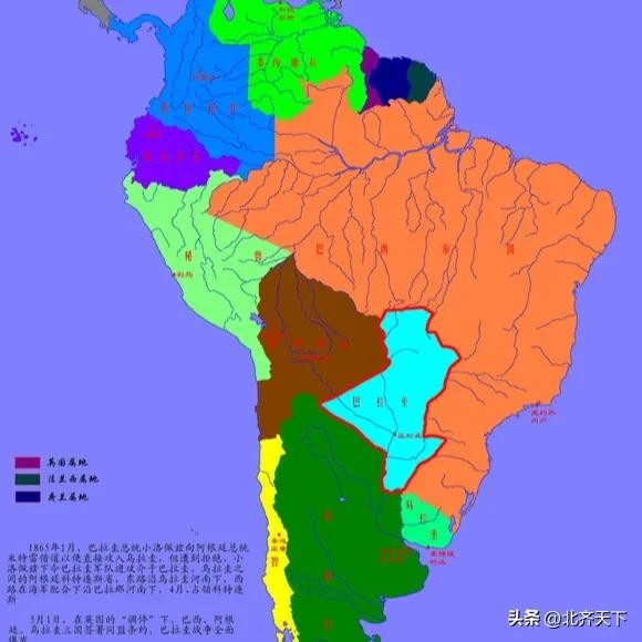 这张图,是举世震惊的“巴拉圭战争”刚开战时的地图。在巴拉圭战争之前,巴拉圭是南美洲名副其实的第一霸主,其经济实力、工业规模远超巴西、阿根廷,是综合国力仅次于美国的西半球第二强国。由于巴拉圭高度的工业成就,造成了巴拉圭两代总统(大小洛佩兹总统)目空一切的思想,居然以一己之力单挑整个南美,开启了轰轰烈烈的巴拉圭战争!其实巴拉圭战争的深层次原因,是欧洲列强不允许在拉美出现一个独立自主的富强国度,于是撺掇巴西、阿根廷、乌拉圭将巴拉圭“妖魔化”,各种干涉制裁巴拉圭。巴拉圭忍无可忍,无需再忍了!!!结果,巴拉圭被周围国家群殴(还包括联军背后的欧洲列强),但是巴拉圭宁死不屈,战死到最后一人,最后造成了这场“世界近代史上第一场战争”的极度惨烈!经过这场毁灭性的打击,巴拉圭丧失了一半的领土,巴拉圭的人口由53万减少到22万,其中男子不到3万!巴拉圭战争对于南美洲来说是一场悲剧。从此,巴拉圭乃至整个南美洲的现代化进程,彻底失败了。从此南美乃至整个拉丁美洲走向了半殖民地化的道路,沦为了列强大国的后花园。再次独立之后的巴拉圭没落为一个三流的保守内陆国家。