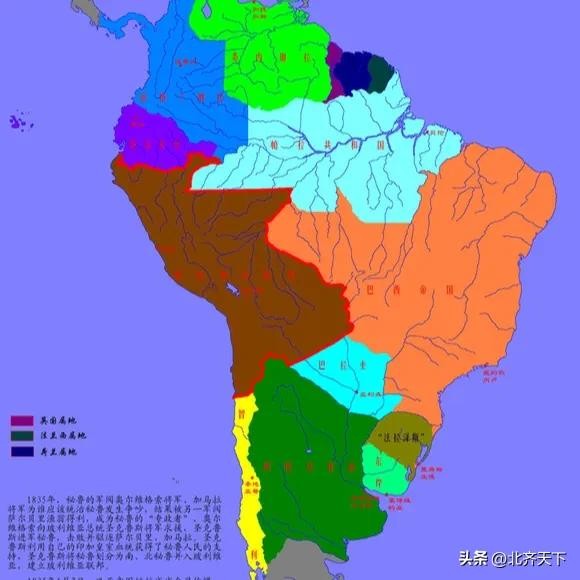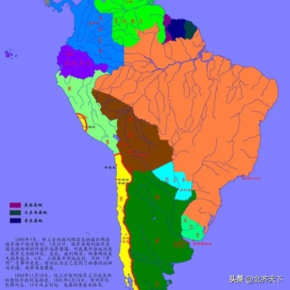 这张图是太平洋战争时期的地图,智利击败玻利维亚与秘鲁联军,占领秘鲁首都利马,并把秘鲁国家博物馆的所有文物,全部抢回家(包括大量珍贵的印加文物)智利也是世界上极少数几个独立后一直都在扩张领土的现代国家!