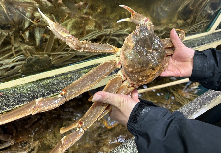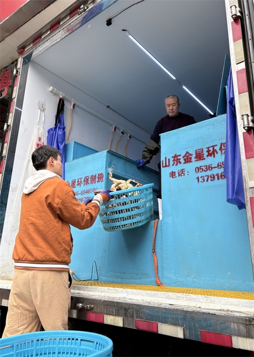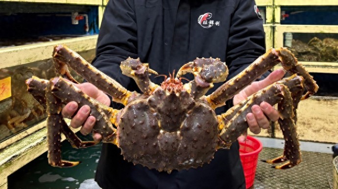 走进主营帝王蟹、松叶蟹的旺鲜利水产,仿佛走进一家小型水族馆,每个池子里都“住”满了这些张牙舞爪的大家伙。店门口,几位工人师傅还在流水线作业,把从车上卸下的蟹按照个头大小分拣到篮筐里,再放进不同的水池。店主小郭告诉记者,店内现有几千斤俄罗斯运来的帝王蟹,到了晚上就会发往沈阳、青岛、济南等地的水产批发市场,最近都保持着这样的大出货量。