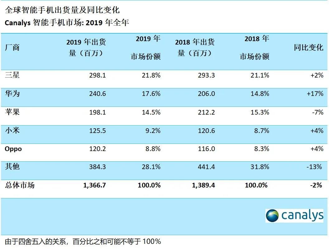 凭借“高端化产品+本地化运营”这个策略,到2019年,华为手机全球出货量达到了2.4亿台,市场份额为17.6%,超越苹果、仅次于三星,位于全球第二。