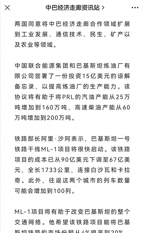 双方还签署了多项合作文件,包括共建“一带一路”、交通基础设施、农产品输华等领域的项目。并且,“瓜达尔新国际机场项目”也被列入了优先推进的项目清单中。这些合作文件的签署,标志着中巴两国的合作迈向了一个新的阶段。而在推动重大互联互通项目早日落地并取得实质成果方面,两国也将加强合作。巴方明确表示愿意同中国密切合作,推动协助其经济走廊高质量发展。总体而言,中巴铁路的建设不仅将促进中巴两国的经济发展,还将极大地促进亚洲内部各国家和地区的贸易往来。中巴铁路的建成,标志着“一带一路”建设取得了重大进展,同时也将对全球的区域经济发展带来深远的影响。巴基斯坦降低铁路干线建设成本,提升运输效率巴基斯坦即将启动其第一个铁路干线ML-1,这是连接卡拉奇和白沙瓦的主干线。最近,巴基斯坦铁道部透露了一个重要消息:他们计划再次降低该项目的建设成本,从100亿美元下调至67亿美元。