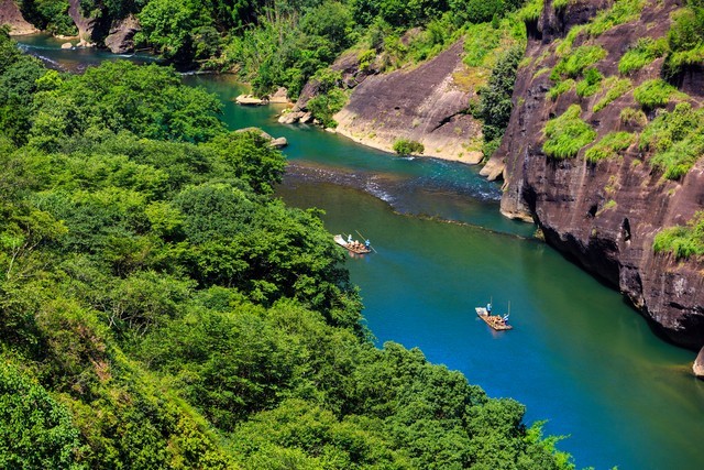 丹霞地貌与九曲溪构成山水画卷,兼具朱熹理学文化与岩茶文化,是世界文化与自然双遗产。