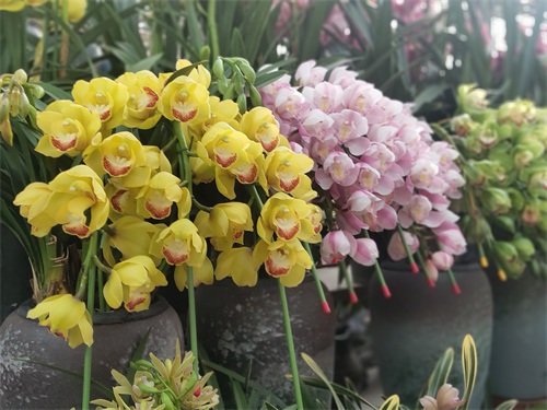 大花蕙兰也是南方比较受欢迎的年宵花卉,它是大型兰花的一种,集中盛开在每年的2月到3月份,生长的时候对湿度要求比较高,因此北方对它来说太过干燥了。相较于兰花,大花惠兰的花朵大气饱满,而且花色艳丽,精致而极具视觉冲击力,因此搭配春节的过节氛围,是非常合适的。