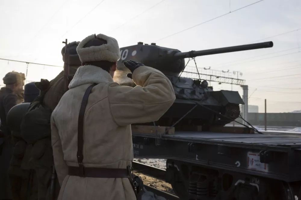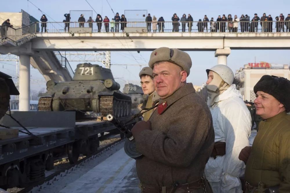 当运载T-34坦克的平板车驶入俄罗斯境内之后,每经过一处车站,当地政府都会举行热烈的欢迎仪式,而且当地的民众会主动地换上二战军装,列队欢迎功勋坦克。